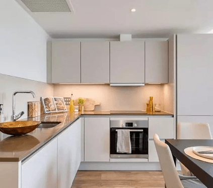The space was transformed into a stylish, bright, and functional kitchen that meets modern design standards. The kitchen is even, symmetrical, and visually light. Every element — from cabinets to tiles — was installed with precision, reflecting the clean modern style presented in the reference.
